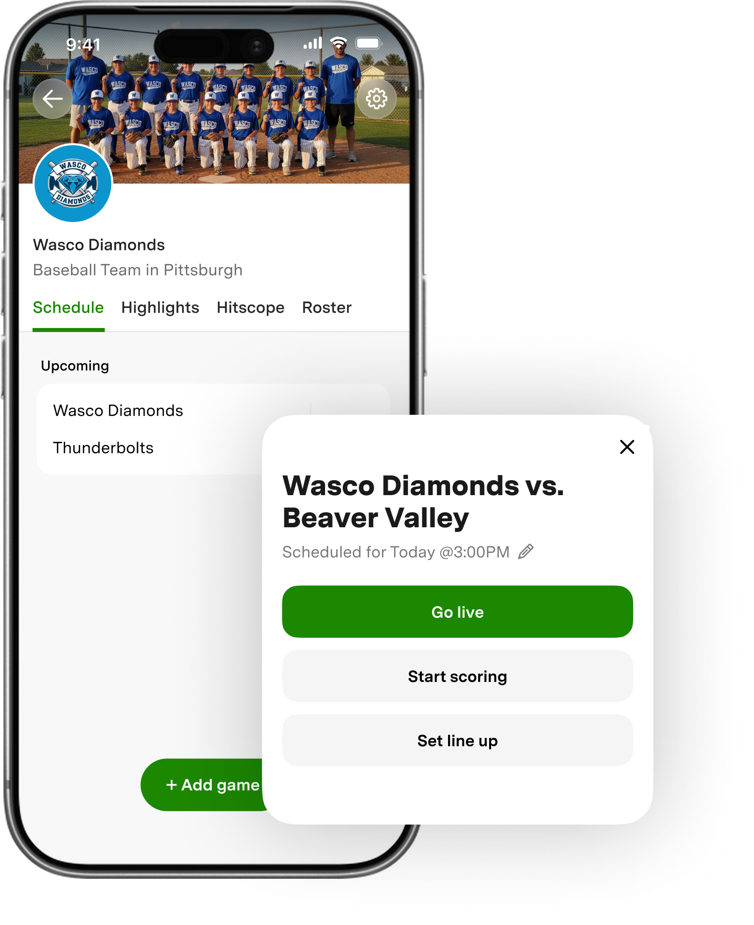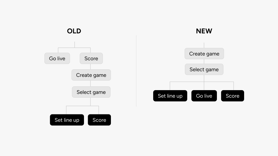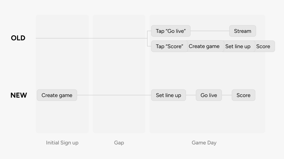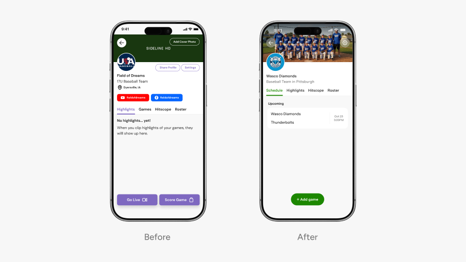 The easiest fix would have been tooltips and walkthroughs. But the information architecture itself was wrong, and I didn't want to put a band-aid on it. The old flow asked users to pick an action first (Go Live or Score), then create a game to attach it to. People don't think that way. They think "I have a game Saturday, maybe I'll try streaming it." So I flipped the whole thing. Create the game first. Then branch into actions from there. The team page now defaults to a Schedule tab showing the game you just created. Tap the game, and you get an action sheet with everything you can do for it.