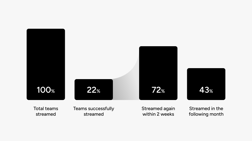 Out of all newly created teams on sidelineHD, only 22% went on to stream their first game. But retention told a different story: 72% of teams who did stream came back within two weeks, and 43% kept going the following month. The machine worked once people got through. The problem was getting them there.