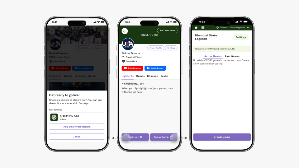 sidelineHD is a live streaming platform for youth sports, built by Diamond Kinetics. A volunteer parent at the game streams with their phone while another scores from the bleachers. Together, they produce a broadcast with a scoreboard overlay that the rest of the team can watch from home. After the game, scoring data generates clips and highlights. The whole thing depends on someone actually streaming, and only 22% of new teams were doing that.